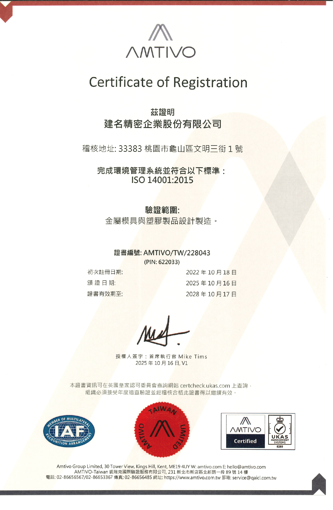 建名精密具備完整的國際管理系統認證,包括 ISO 9001、ISO 14001 及 ISO 13485,展現公司在品質、環境、及醫療器材管理上的高規格自律與持續改善力。